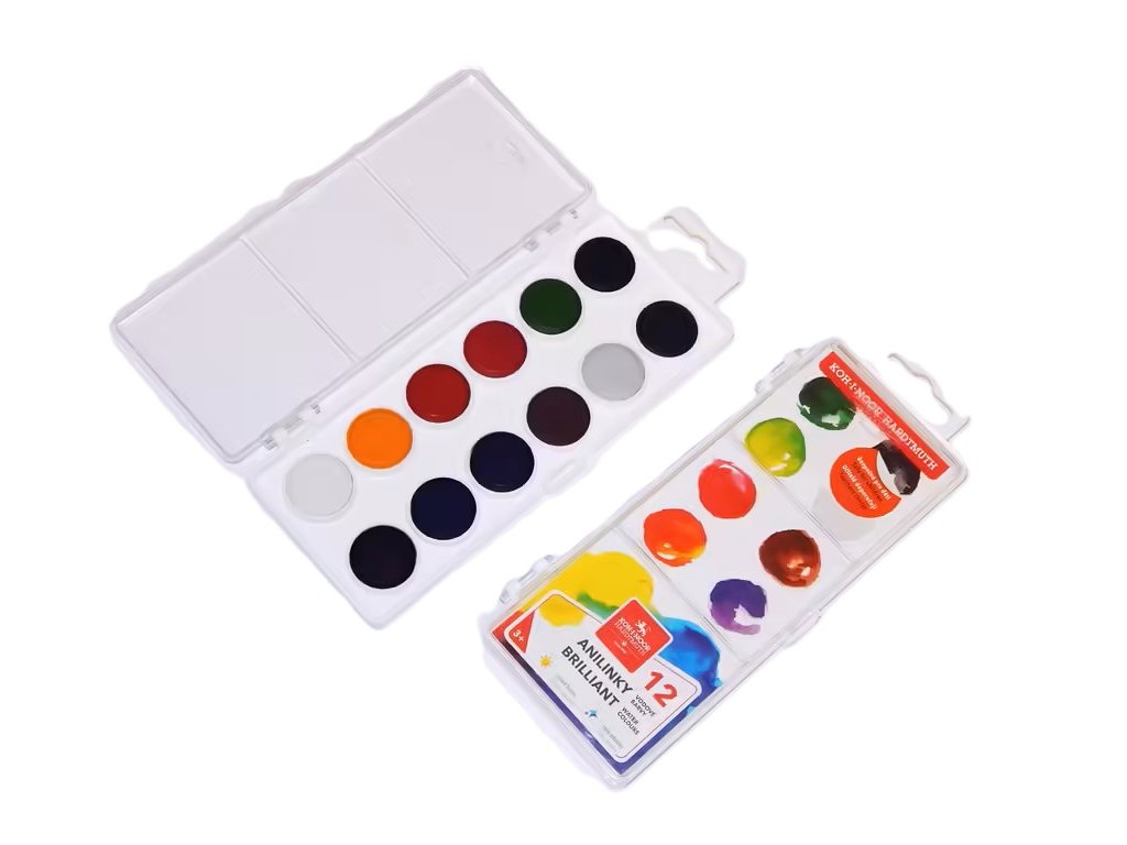 Vodové barvy o průměru tablet 22 mm s 12ti brilantními odstíny. Vložené v plastovém barevníku s transparentním víčkem.