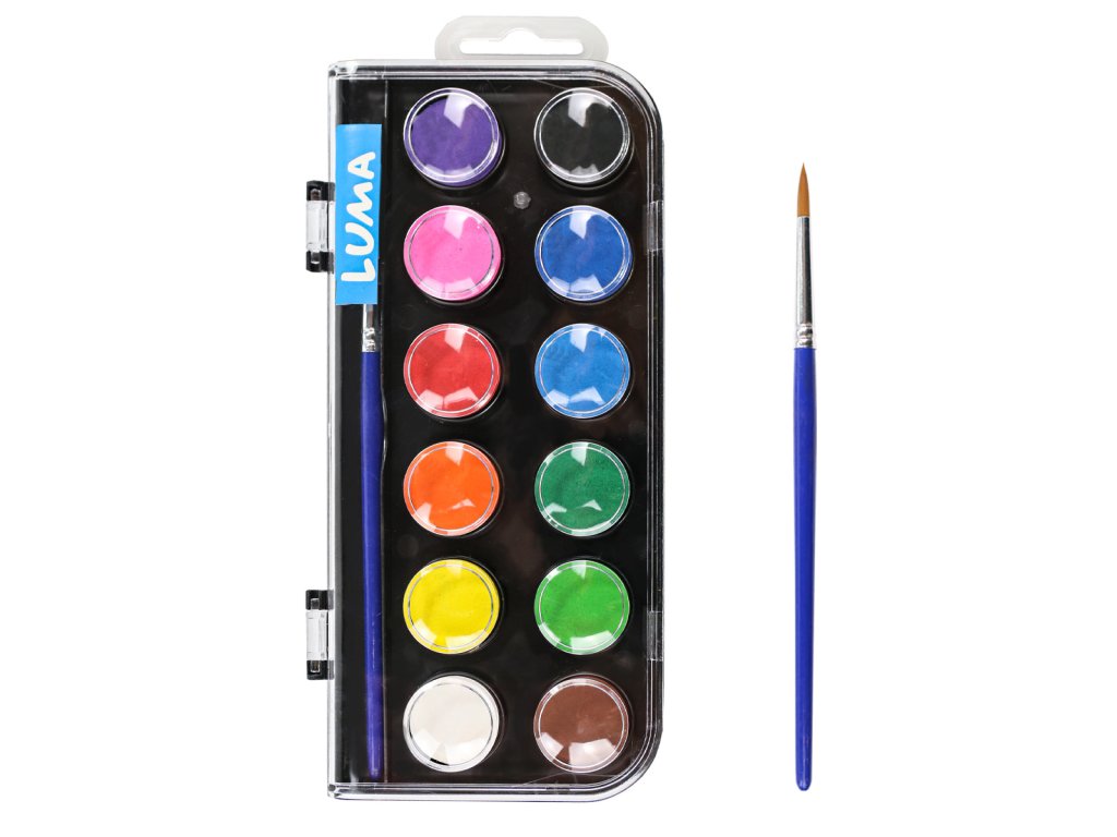 Kvalitní vodové barvy. Syté a zářivé barvy prémiové kvality. Syntetický štětec součástí balení. V plastové paletě s víčkem, 12 barev, 28 mm.