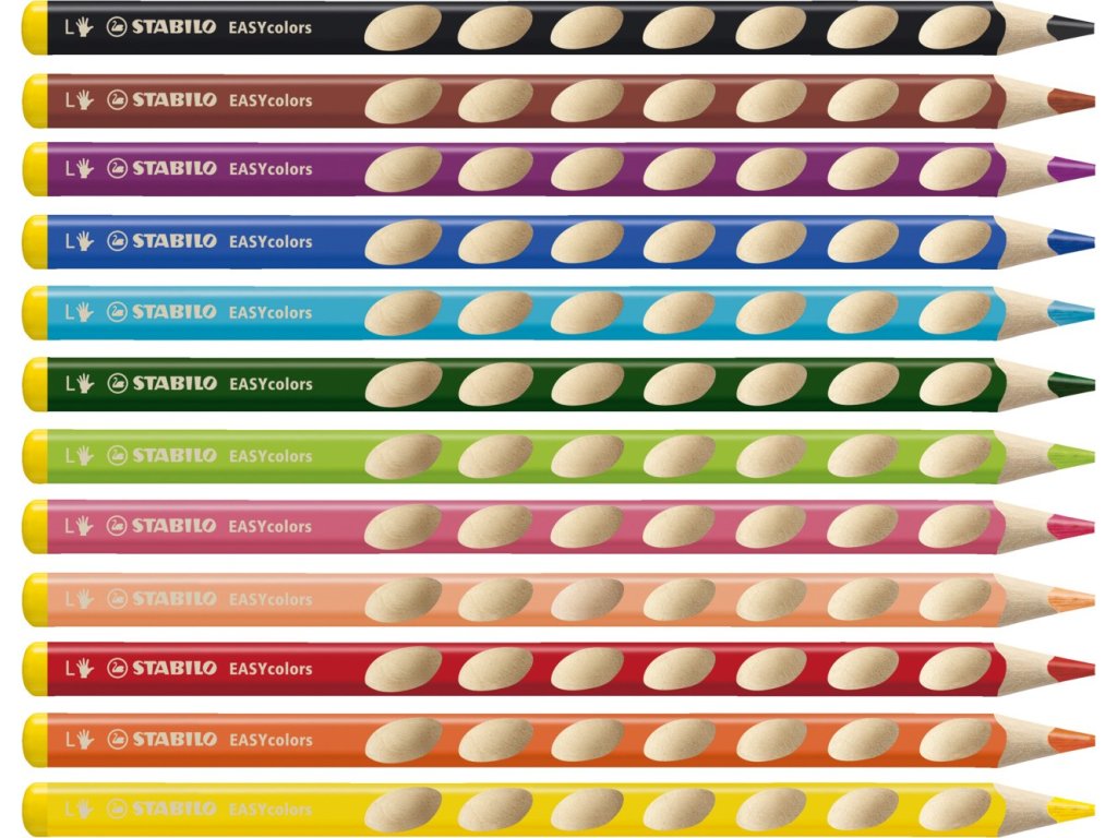 STABILO EASYcolors. Ergonomické trojhranné barevné pastelky pro předškolní děti a školáky od 5 let. První ergonomická barevná pastelka speciálně pro leváky a praváky. Trojhranný tvar a neklouzavé úchopové plošky zajišťují uvolněné držení ruky. Žlutý nebo červený konec pastelky označuje levou nebo pravou verzi. Brilantní barvy ve dřevě z udržitelného lesního hospodářství. Pastelky jsou vyrobeny ze dřeva certifikovaného PEFC® (PEFC/04-31-1728). Každá pastelka má štítek na jméno. Český výrobek. Průměr tuhy: 4,2 mm.