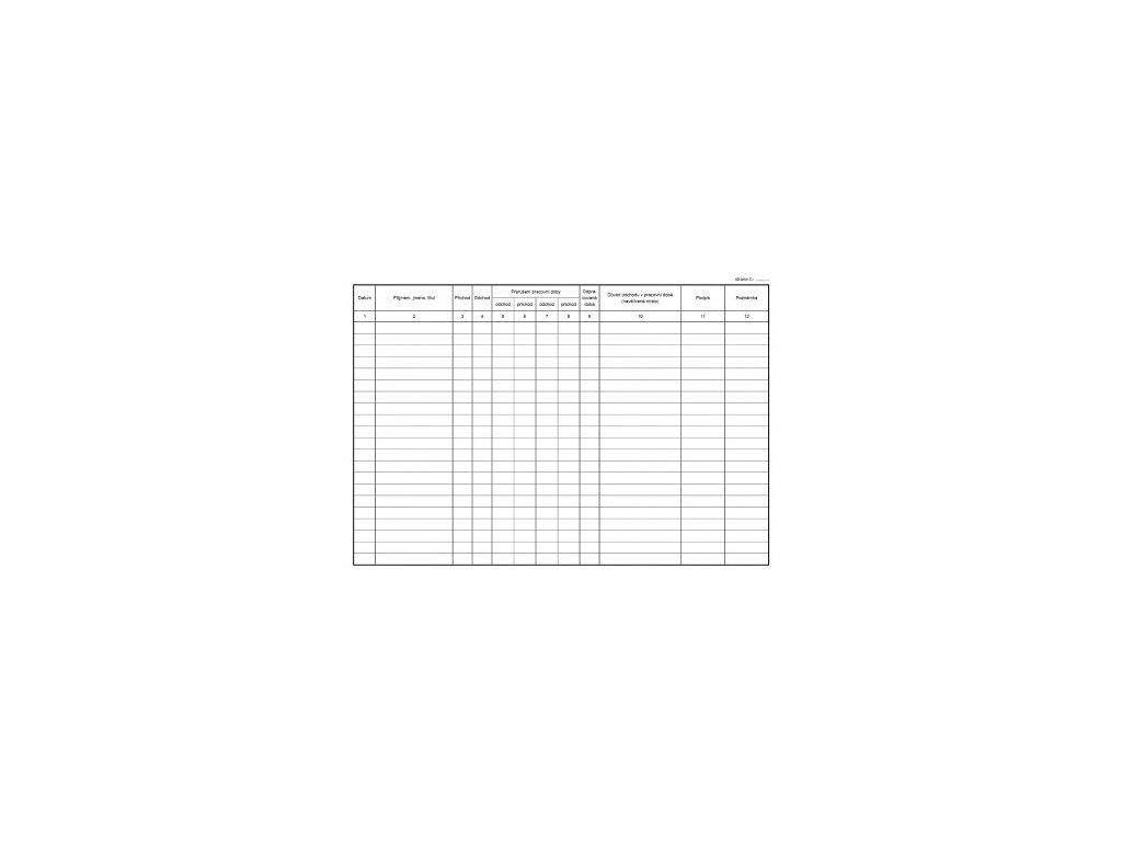 Kniha příchodů a odchodů - tiskopis z recyklovaného hlazeného papíru. Sešit 40 stran, oboustranný tisk, formát A4 na šířku.