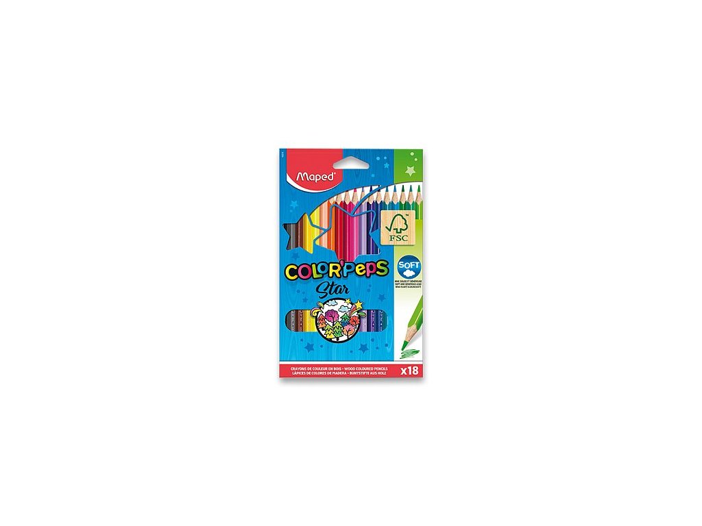 Souprava 18 kusů pastelek s veselým designem. Ergonomické pastelky Maped Color'Peps mají trojhranné tělo, měkkou odolnou tuhu a jasné barvy. Délka pastelky cca 17 cm. Tloušťka tuhy 2,9 mm.