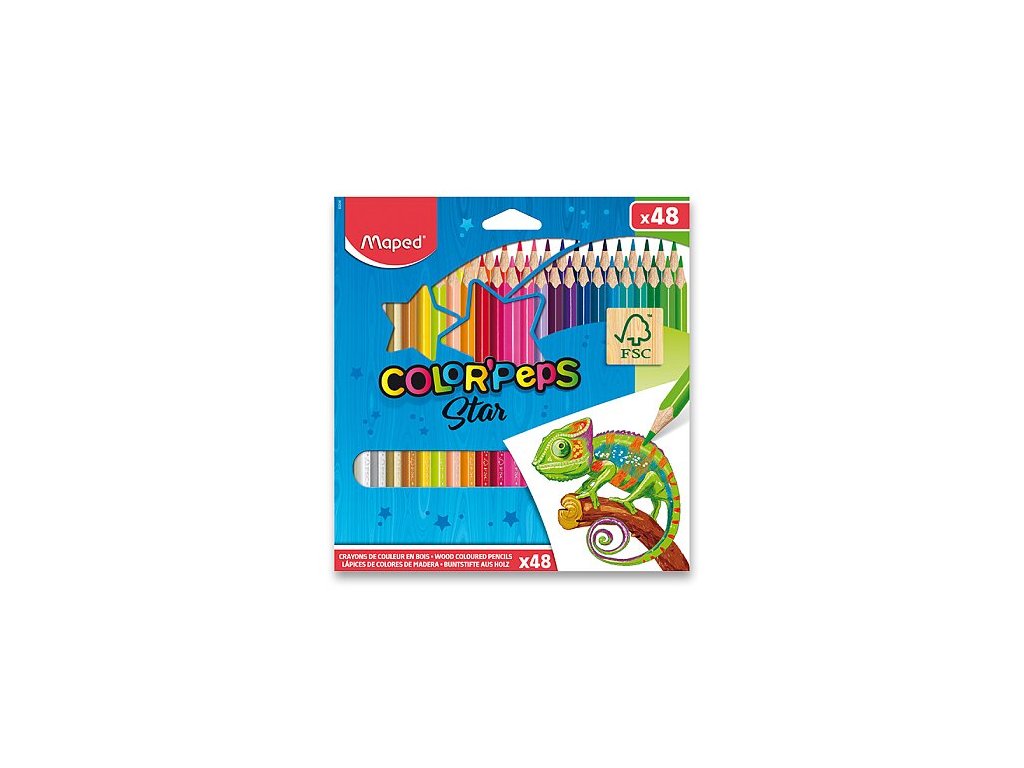 Souprava 48 kusů pastelek s veselým designem. Ergonomické pastelky Maped Color'Peps mají trojhranné tělo, měkkou odolnou tuhu a jasné barvy. Délka pastelky cca 17 cm. Tloušťka tuhy 2,9 mm.