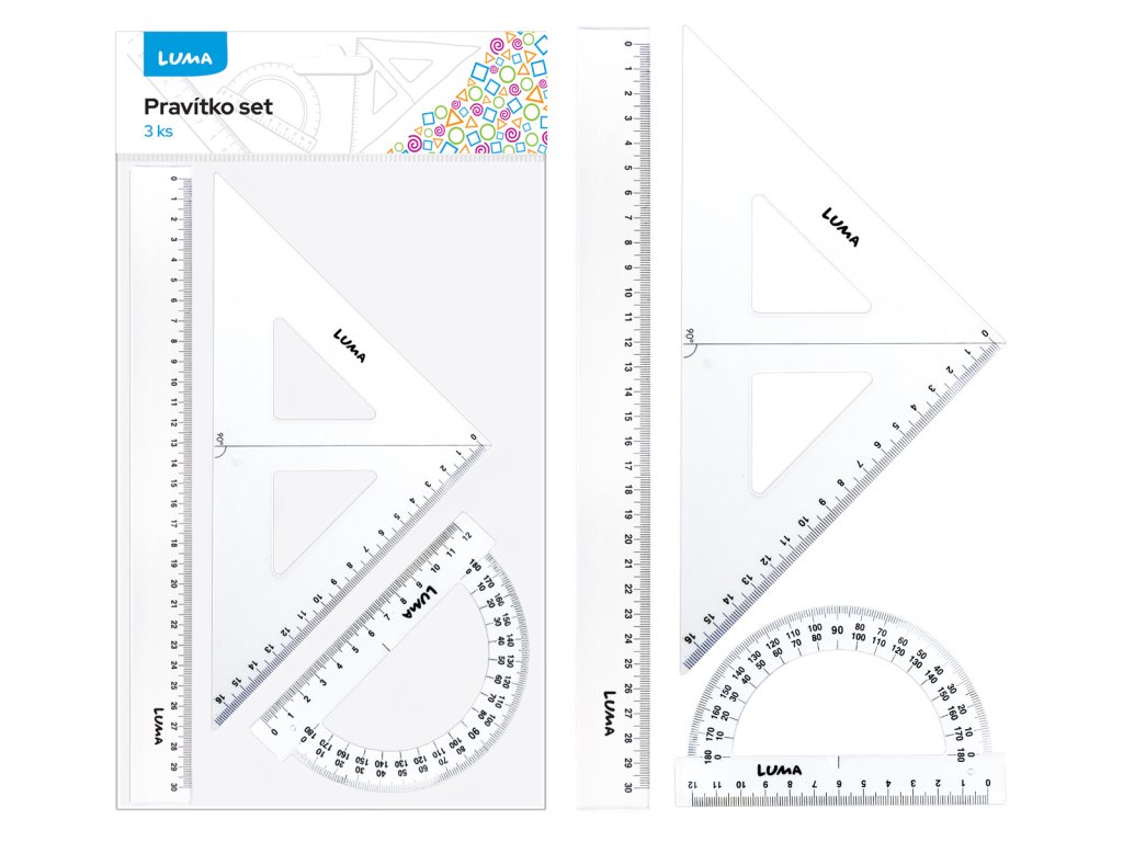 - sada obsahuje pravítko 30cm, úhloměr, trojúhelník s ryskou