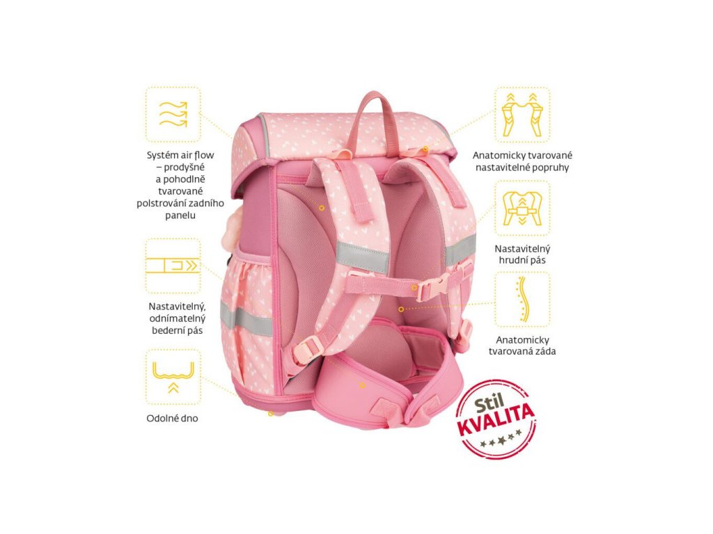 - POHODLÍ – výškově nastavitelný hrudní a nově i odnímatelný bederní pás s kvalitní přezkou zajistí pohodlné usazení aktovky na zádech dítěte i správné rozložení váhy