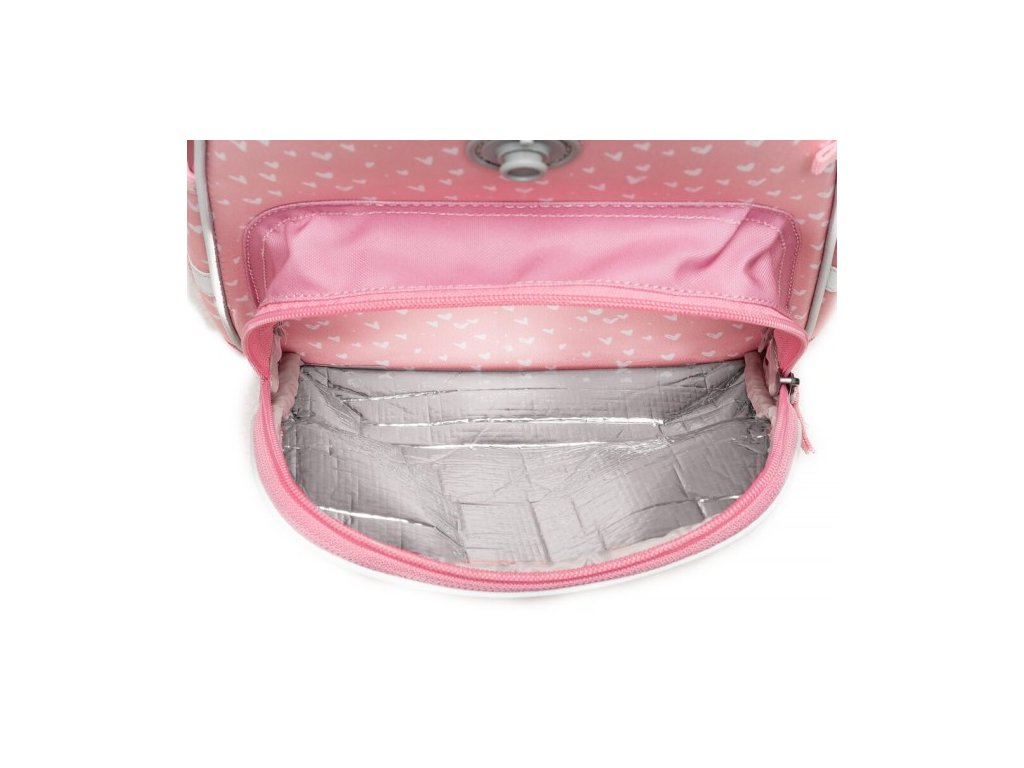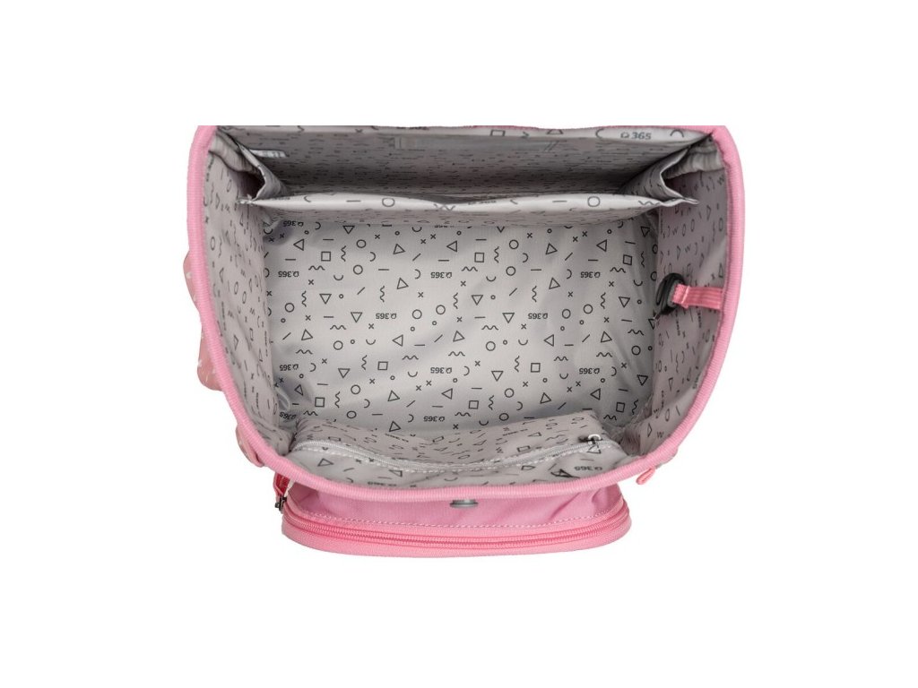 - VNITŘNÍ USPOŘÁDÁNÍ – prostorná hlavní vnitřní komora je rozdělená látkovou přepážkou pro uložení boxu na sešity či knih. Součástí hlavní komory je také kapsička pro uložení drobností, odepínatelný kroužek na klíč a štítek na jméno a adresu. Ve víku je průhledná kapsička na rozvrh hodin