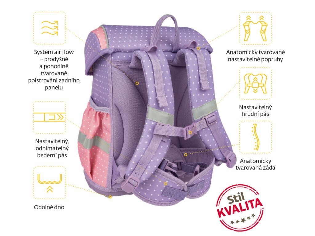 - POHODLÍ – výškově nastavitelný hrudní a nově i odnímatelný bederní pás s kvalitní přezkou zajistí pohodlné usazení aktovky na zádech dítěte i správné rozložení váhy