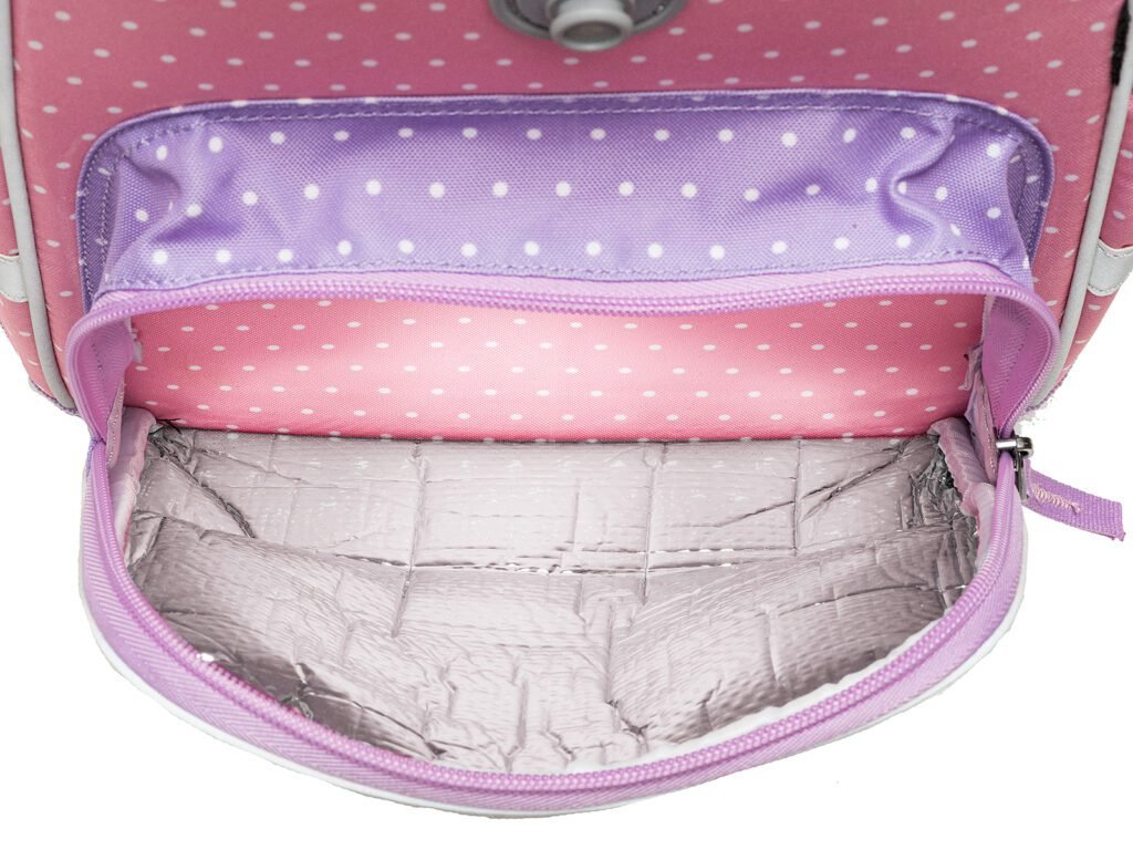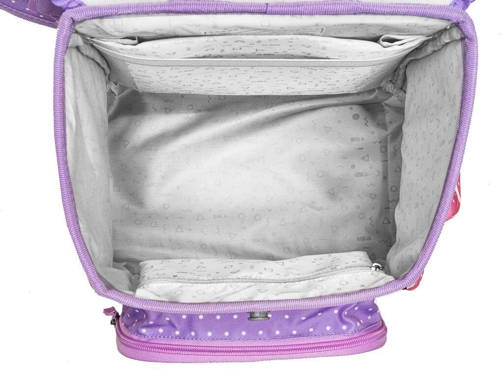 - VNITŘNÍ USPOŘÁDÁNÍ – prostorná hlavní vnitřní komora je rozdělená látkovou přepážkou pro uložení boxu na sešity či knih. Součástí hlavní komory je také kapsička pro uložení drobností, odepínatelný kroužek na klíč a štítek na jméno a adresu. Ve víku je průhledná kapsička na rozvrh hodin