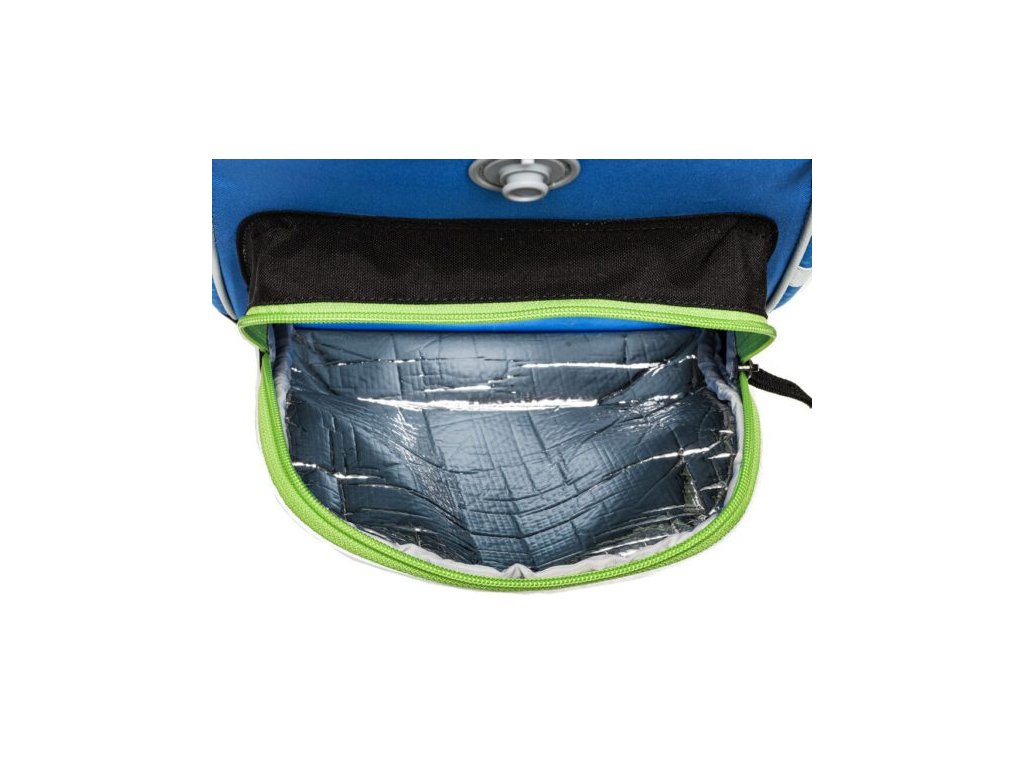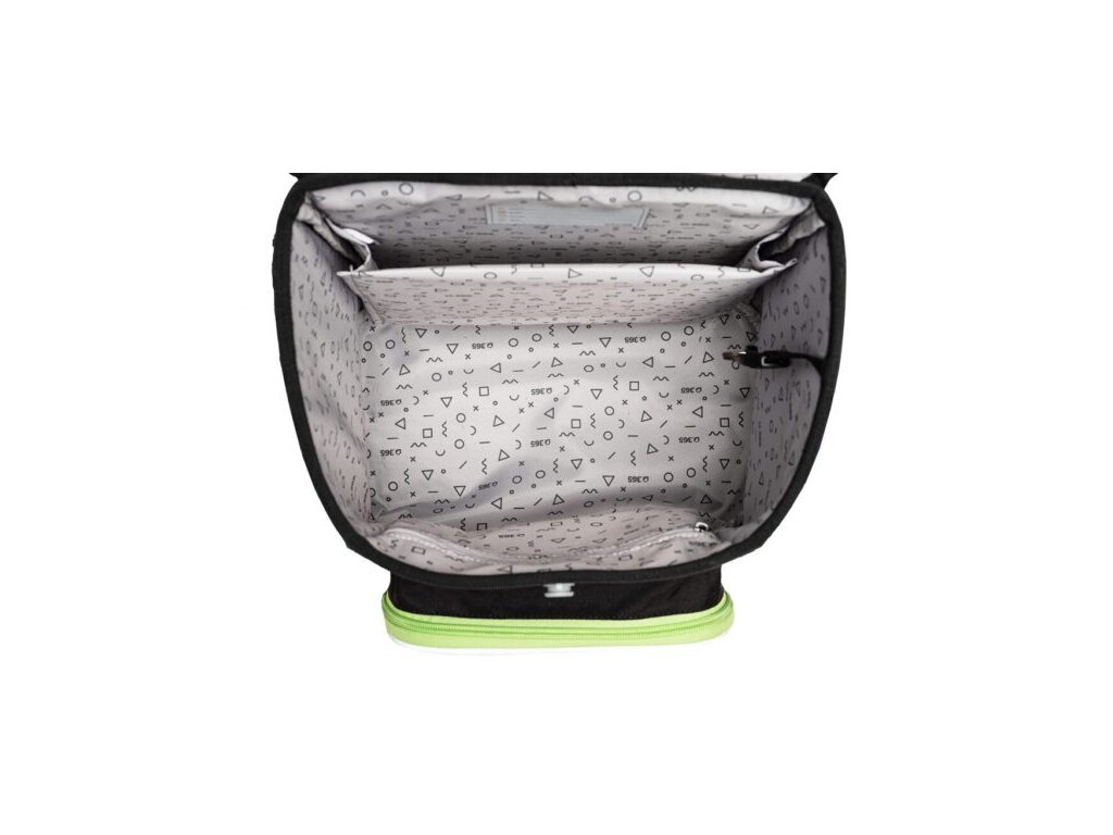 - VNITŘNÍ USPOŘÁDÁNÍ – prostorná hlavní vnitřní komora je rozdělená látkovou přepážkou pro uložení boxu na sešity či knih. Součástí hlavní komory je také kapsička pro uložení drobností, odepínatelný kroužek na klíč a štítek na jméno a adresu. Ve víku je průhledná kapsička na rozvrh hodin