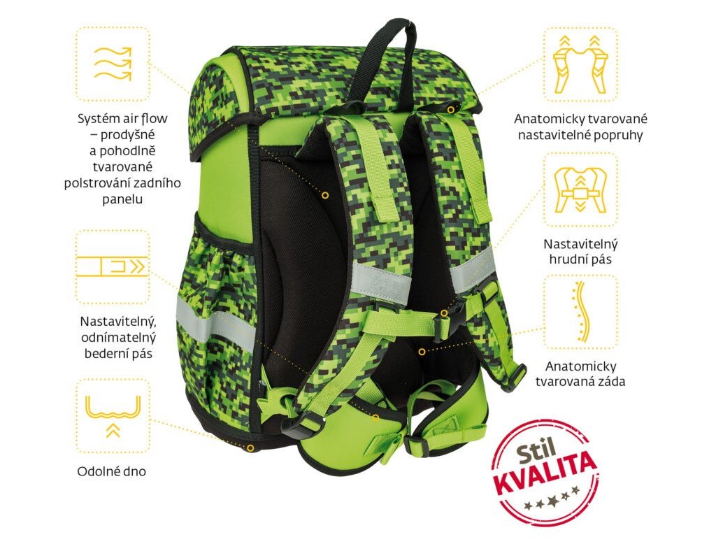 - POHODLÍ – výškově nastavitelný hrudní a nově i odnímatelný bederní pás s kvalitní přezkou zajistí pohodlné usazení aktovky na zádech dítěte i správné rozložení váhy