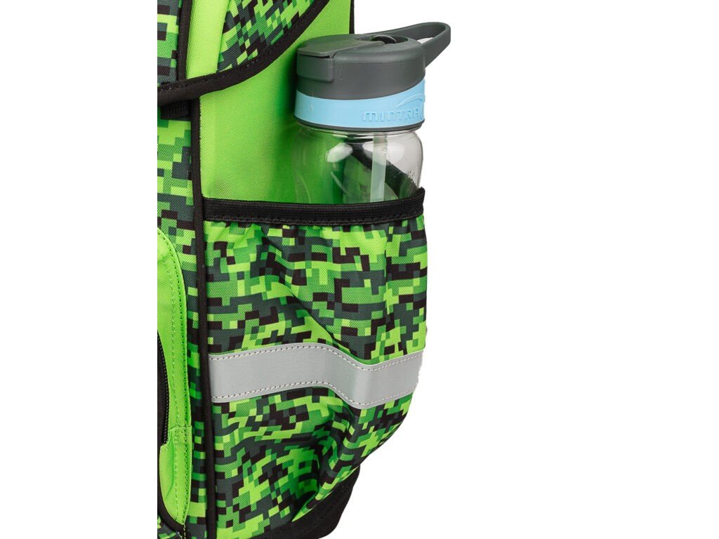 - Po obou stranách batohu se nalézají kapsy na deštník nebo lahev s pitím. Kapsy svým umístěním a elastickými okraji pomáhají eliminovat riziko rozlití nápoje a poničení obsahu aktovky.