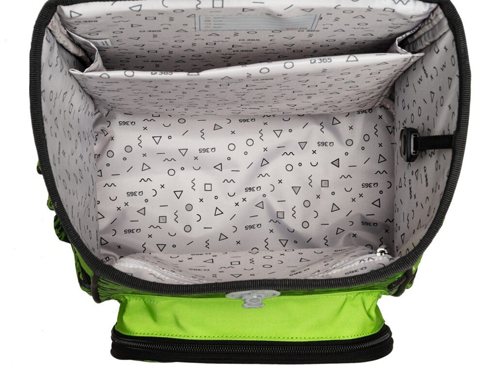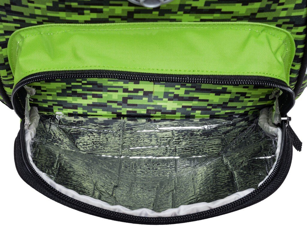 - VNITŘNÍ USPOŘÁDÁNÍ – prostorná hlavní vnitřní komora je rozdělená látkovou přepážkou pro uložení boxu na sešity či knih. Součástí hlavní komory je také kapsička pro uložení drobností, odepínatelný kroužek na klíč a štítek na jméno a adresu. Ve víku je průhledná kapsička na rozvrh hodin