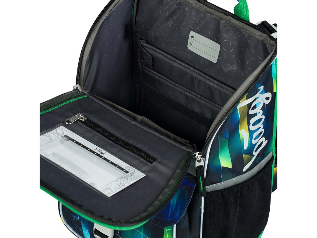 - Uvnitř aktovky je průhledná kapsa na rozvrh a vnitřní organizér umožňující rovnoměrné rozložení hmotnosti, doplněný gumičkou pro fixaci.
