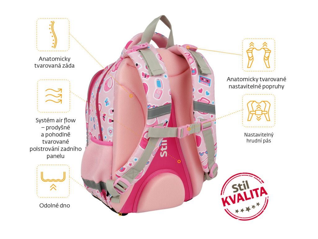 Kvalitní, velmi lehký, ergonomicky tvarovaný a odlehčený školní batoh je vybaven reflexními prvky a anatomicky tvarovanými zády s pevnou konstrukcí.