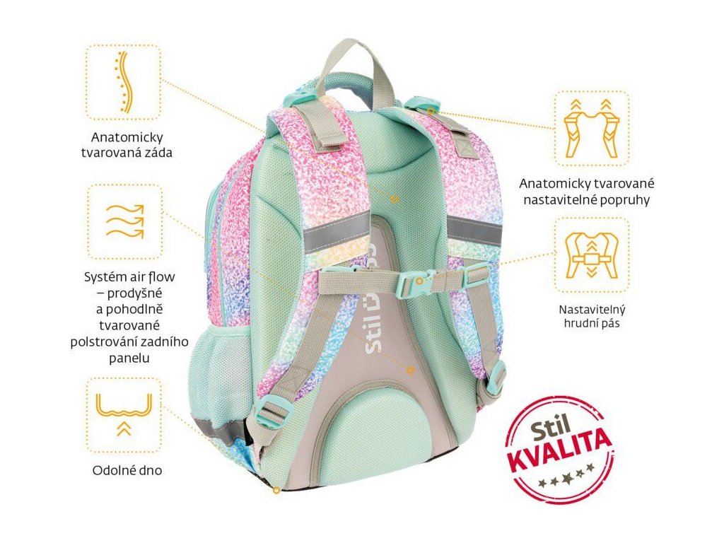 Kvalitní, velmi lehký, ergonomicky tvarovaný a odlehčený školní batoh je vybaven reflexními prvky a anatomicky tvarovanými zády s pevnou konstrukcí.