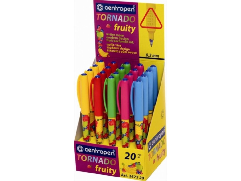 Pero Tornádo s ergo držením s masážními body, které aktivují na bříškách prstů hmatové receptory a zaručují příjemné zdravé psaní bez únavy. Vhodná náhrada plnicích per pro školáky, píše lehce bez tlačení, ideální i pro leváky a děti s poruchami učení. Zmizíkovatelný modrý inkoust a tenká, rovnoměrná stopa písma. Průměr kuličky 0,5 mm, šíře stopy 0,3 mm. Inkoust rolleru parfemován ovocnou vůní - banán, jablko, malina, jahoda, borůvka.