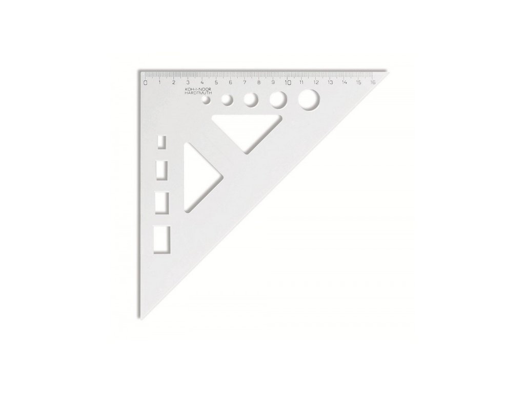 Školní pravoúhlý trojúhelník s výřezy z pevného, transparentního plastu. Délka měřící strany 15 cm.
